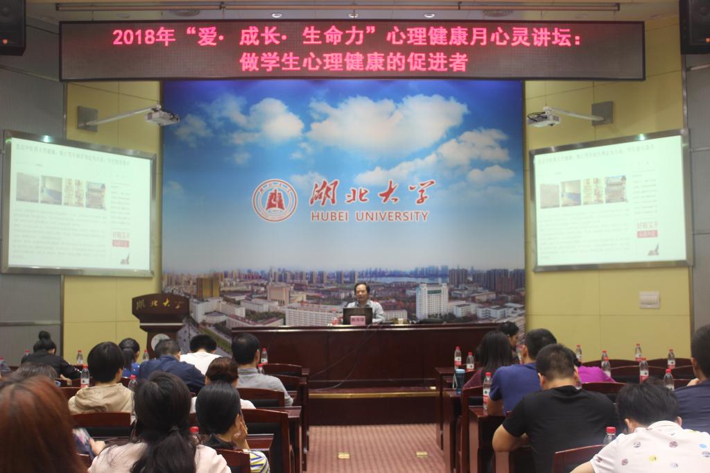 5月31日下午,由学生工作部心理健康教育中心主办、化学化工学院承办的2018年“爱?成长?生命力”心理健康月活动——“心灵讲坛”在会议中心思诚厅如期举行。邀请武汉大学心理健康教育中心主任赖海雄做题为“做学生心理健康的促进者”专题报告。我校班主任、辅导员、后勤职工近100人参加此次讲坛。